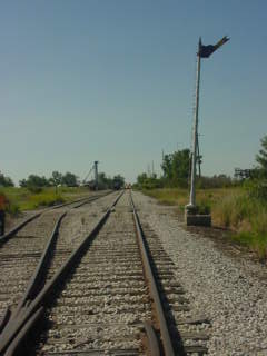 A semaphore signal warns of the Iowa, Chicago & Eastern Railroad crossing ahead.