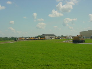 The crossing diamond and a Union Pacific locomotive on the interchange track.