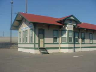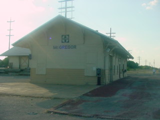 The Santa Fe McGregor station, a unique L-shaped depot, is a circa 1904 building at the junction of the Gulf, Colorado & Santa Fe (now BNSF) and the St. Louis Southwestern (Cotton Belt, now Union Pacific) railways. Santa Fe's logo, a cross inside of a circle, is displayed on the building. The depot still retains its original feel, but the neighboring railroad control tower was dismantled in 1967. Amtrak customers use the adjacent platform.