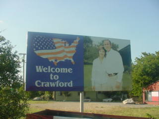 The Welcome to Crawford Texas sign included a photograph of George and Laura Bush.