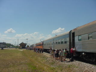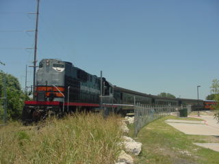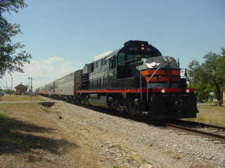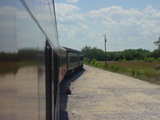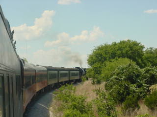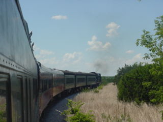 Our train consisted RSD-12 442, coaches 1684 "Lake Buchanan" and 1699 "Lake Marble Falls", concession car 1726 "Lake Austin", coaches 325 "Buckeye Lake" and 107 "Buckeye Trail", NKP Pullman car 151 "City of Chicago" and Santa Fe dorm-lounge 1343.
