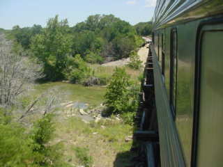 Crossing the 140 foot wooden trestle across the South Gabriel River.