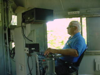 We had reached the southernmost point, stopped and the passengers were allowed to switch cars if they wanted and and most came out into the open car. Our engineer attracted my attention and asked if I wanted a cab ride. I said "Yes!" and U opened a gate at the end of the car then walked on the back porch of the GP9 and went into the cab. The fireman gave me the seat behind him and soon we were on our way back to Belton.