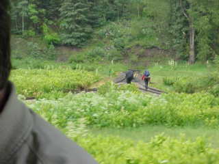 The train stopped at Elk Park to let off several hikers, two used the wye track as a path away from the train.