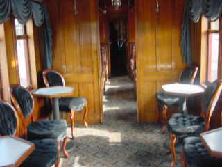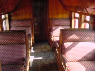Interior of "Cinco Animas", ex. Denver and Rio Grande B-2 1917, exx. Denver and Rio Grande B-5 1913, exxx. Denver and Rio Grande outfit car 0452, exxxx. Denver and Rio Grande tourist car, exxxxx. Denver and Rio Grande 452, nee Denver and Rio Grande emigrant sleeping car 103 built in 1883. It was sold in 1954 and moved to Oklahoma. In 1963, the car was purchased by the Cinco Animas Corporation and returned to Colorado, where the vestibule was removed and an open platform with railings was added.