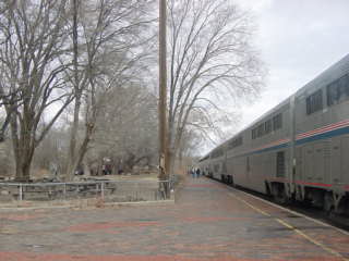 2/24/2008 I was not feeling too well when I awoke and laid in bed almost to La Junta where I resumed watching the concert. During the fresh air stop, I went to Safeway for some snacks and visited the station then we departed on time and I read the Pueblo Chieftain as the Rolling Stones continued to play taking me halfway up Raton Pass, where I took some fresh air before having a nap. I awoke as the train was climbing Glorieta Pass in a light rain storm and started work on yesterday's stories. At Canyoncito, we went into the siding for the eastbound Southwest Chief then arrived at Lamy for an extended stop due to a red signal at the west end.