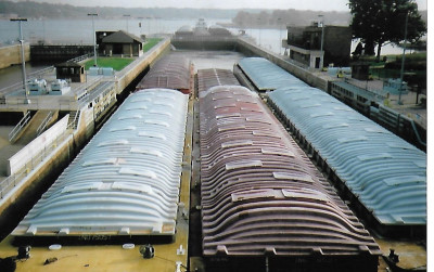 Barges lashed together to move upriver on the Mississippi River.