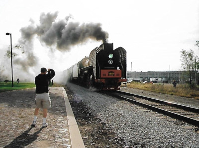 The QJ's then reversed down the track towards our train but made a safety stop before coupling onto our train. There is no automatic stoker on these engines and every scoop of coal is shovelled by hand. The train consisted of QJ 6988 and QJ 7081, tool car 9021, coaches {all former Montreal commuter coaches} 810, 820, 807, 819, 816, 804, 838 and 806, 101 "Abraham Lincoln" and 100 "Hawkeye".
