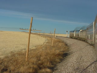 1/6/2009 I arose in very western Kansas and went to the dining car for my breakfast, sitting with a lady from Boston and enjoyed the French Toast with sausage patties. Later we arrived at La Junta on an eighteen degree sunny morning and I detrained for some very fresh air and saw Eugene on his last day of being the Amtrak station agent here. He was off to Albuquerque and then El Paso. We departed on time and proceeded west as I watched Rush's "Snakes and Arrows". We stopped at Trinidad just as Disc 1 was ending and Disc 2 took me across Raton Pass to our next fresh air stop at Raton and beyond.