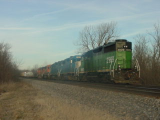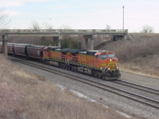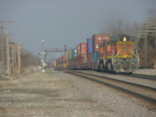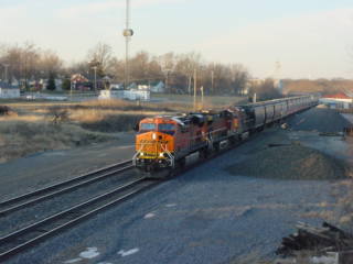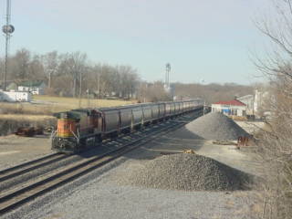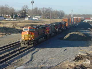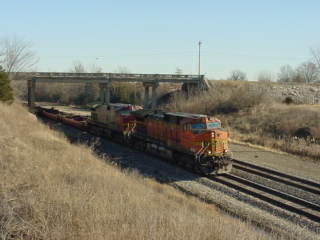1/2/2009 The Road Trip in Search of TrainsI was having breakfast in the lobby when Bob Cox walked in and I quickly finished, grabbed my backpack from Room S and we drove south to Macon, where Bob stopped at Hardee's for his breakfast-to-go. Passing through Callao, I spotted a BNSF train and we doubled back and went into town to find it.
