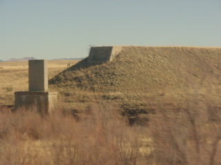 The former Southern Pacific grade and bridge pillar from the line to York Canyon and French, New Mexico. The Rush DVD lasted until west of Springer where I switched to my Queensryche "Mindcrime at the Moore" set, which took me almost all the way to Canyoncito, where I was given a hot towel. We took the siding there for the eastbound Southwest Chief and I then watched Daylight Productions' "San Diego Steam Special" as we waited. The train paused at Lamy before it arrived in a cold 34 degree afternoon in Albuquerque, forty-five minutes early.