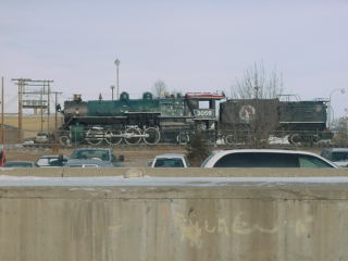 Great Northern 4-8-4 2584 on display in Havre and decorated for the Christmas season. I went into the station and bought an ice cream bar before the Empire Builder departed at 7:03 PM {3:04 PM} with a new train crew. Ham sandwiches with cheese were distributed to passengers, but since I am allergie to cheese, I could not eat them so just enjoyed a Coca-Cola and would wait to eat well again on the Coast Starlight. John Cougar's "Freedom's Road" took me to Shelby.