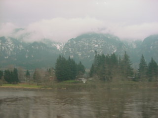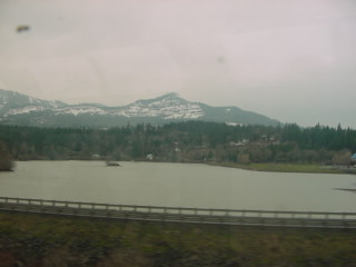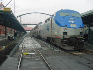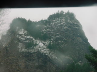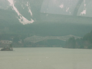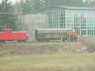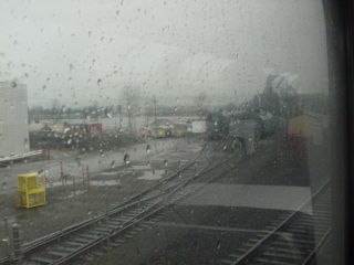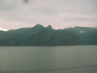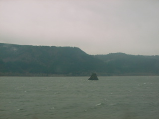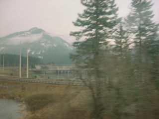We passed a large rock in the River at the west end of the Gorge before the final tunnel. Yes' "Talk" was put back on as it was announced that our estimated time of arrival in Potland was 12:30 PM. Connecting passengers for the Amtrak Cascades trains were told to detrain at Vancouver, after which we rolled west through Camas in the pouring rain to our Vancouver station stop at 12:16 PM {9:08 AM}.