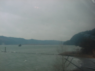 Another view heading west into the storm. At East Bingen, we went into the siding due to track work before stopping at Bingen-White Salmon 10:45 AM {8:04 AM}.