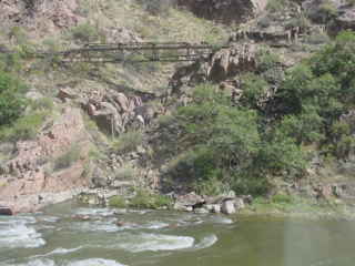 For two railroads to occupy a river valley is not a problem in principle, however, west of Cañon City the Arkansas River cuts through the Royal Gorge, a high plateau of igneous rocks forming a spectacular steep-walled gorge over 1,000 feet deep and 6 miles long. At its narrowest point sheer walls on both sides plunge into the river, creating a nearly impassable barrier. So on this route, two railroads could not share the valley.