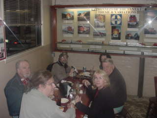 Our group at Philippe's with the Los Angeles Museum of Railroading in the display cases.