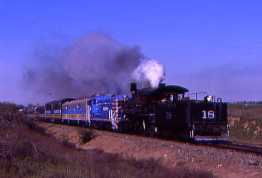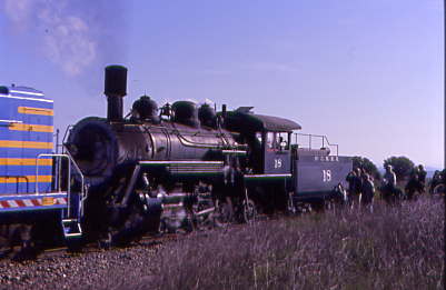 Outside the shops, McCloud 18 was being prepared. Inside, Southern Pacific 0-6-0 1277 was still being worked on. I walked back to the train, whose consist was McCloud 2-8-2 18, Sierra S-12 42, power car, SERA 7005 "El Capitan", SERA lounge 7007, table car "Yosemite Falls", half dome, SERA 7000 "Yosemite Valley" and California Western open car 692 "Quiburi Mission", which I boarded.