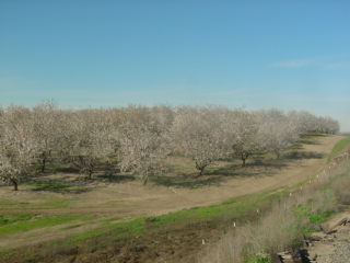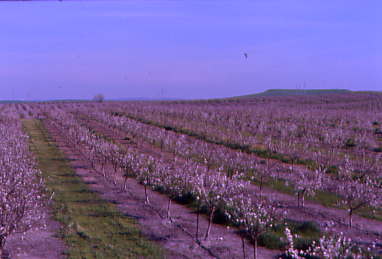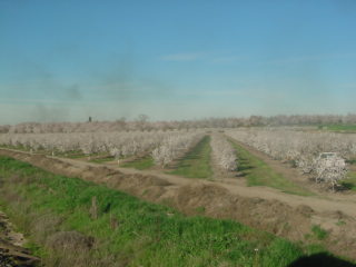 Passing another orchard with beehives.