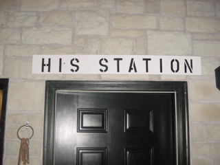 His Station is the men's restroom sign.
