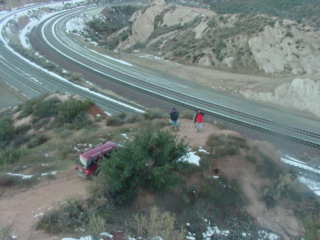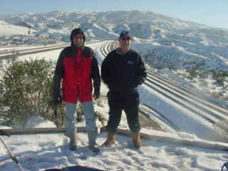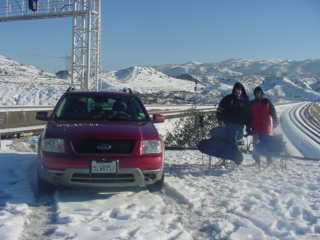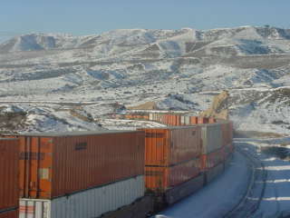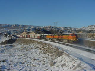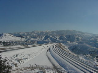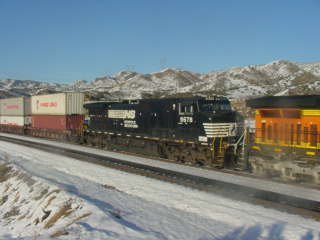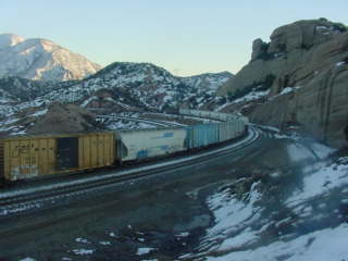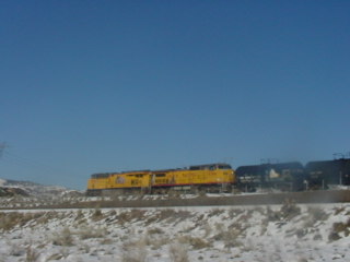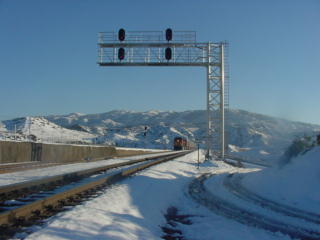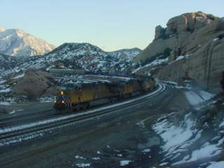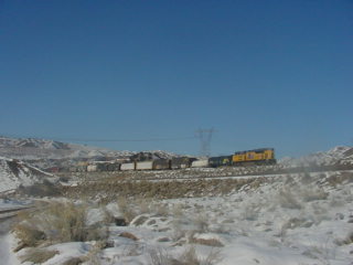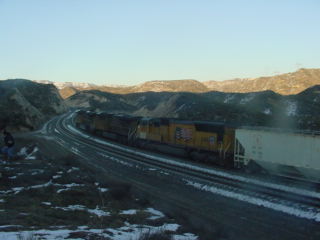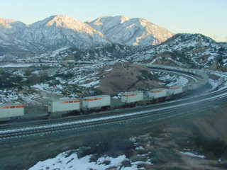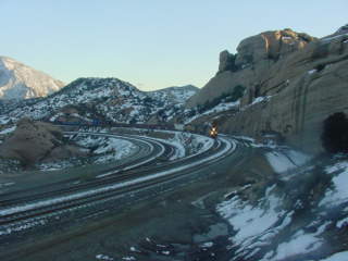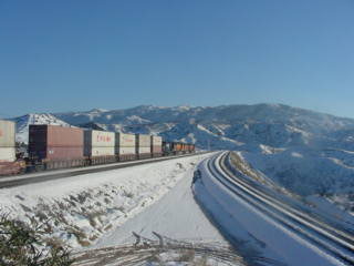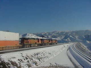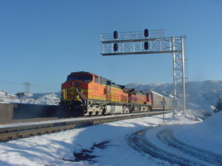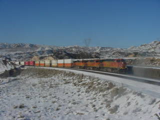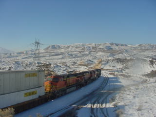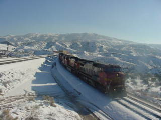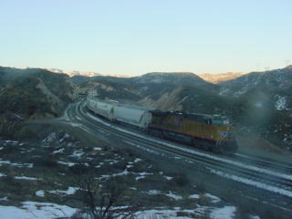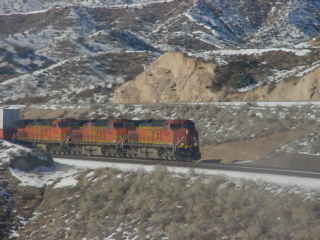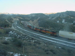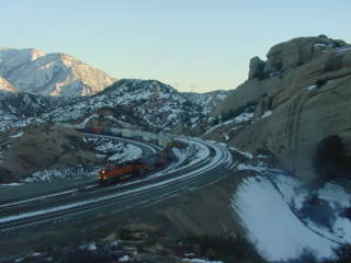 Chris arrived first then shortly thereafter, Larry drove up and we loaded his car and soon were off to Cajon Pass, taking California Highway 57 north to Interstate 210 to Interstate 15. Before Devore, we exited the jammed freeway but were caught by an eastbound BNSF freight. Once he cleared, we drove through Devore and proceeded on Cajon Boulevard through Blu Cut to Cajon Junction. We jumped on the freeway to the next exit and drove up and over the hill on California Highway 138, taking Power Line Road and after the first track, turned right and drove to the hill between where the tracks split. Just as we arrived, here came our first train in the snow.