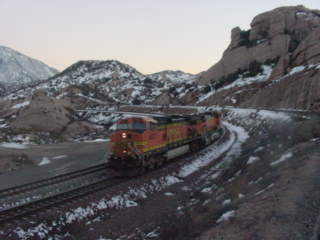 A BNSF helper set returned down through Sullivan's Curve. We drove up to the Summit Inn and I had a steak dinner, after which, we drove home after a great afternoon of railroad photography in the snow of Cajon Pass.