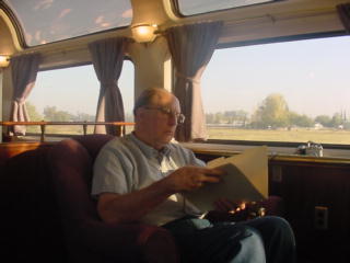 Jerry Wayne Howard, a fellow rider, with whom I became friends. At 6:30 AM, Ken, Jerry, Anton, Chris and I went to the dining car for breakfast and I had the French Toast and pork sausage patties. We departed at 6:38 AM and made our way east but stopped at CP Haggin to let San Joaquin 702 get ahead of us. I then walked to the rear of the train to photograph our progress south down the rails.