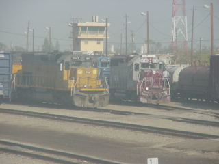 Union Pacific and San Joaquin Valley Railroad locomotives meet in Fresno Yard.