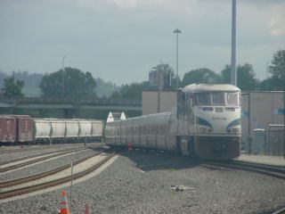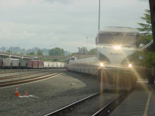 The northbound Train 500 departed for Seattle and we went inside the Tacoma station then Tom walked over to Freighthouse Square while I plugged into the station power and worked on this morning's story. The southbound Coast Starlight arrived about fifteen minutes late then Tom returned and I walked over to Dairy Queen to get some lunch to take with me on the next train. We went out onto the platform to wait for our train to arrive just five minutes late.