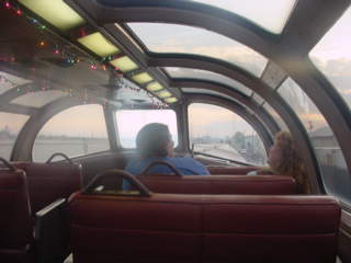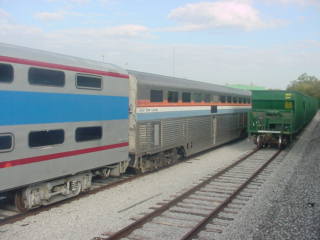 A former Amtrak diner-hounge high-level car of Santa Fe vintage.