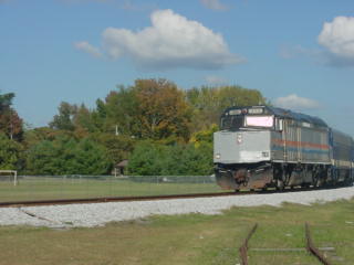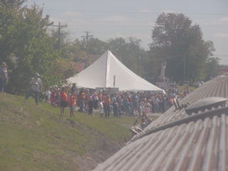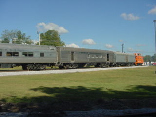 There were two other events going on today - a classic car show and a Civil War Re-enactment. I went to look for a good place from which to photograph the train returning from the spur and found one. We waited and finally moved into the shade. Later we learned that the passing track at spur was 1,200 feet but our train was 1,205 feet so the crew had to cut off the first two locomotives to make the train fit. They then cut off the other two engines then the first two pushed the train passed the fouling point. The other engines then ran around the train so they could be placed on the front. All of that took over an hour but when we finally heard an Amtrak horn, knew the train was returning and soon it came into view.