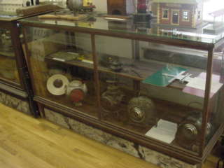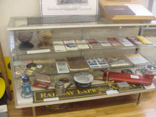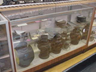 Display case housing lanterns and Tennessee Central timetables.