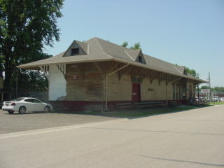 Chicago Rock Island and Pacific Abilene station built in 1887, is a combination depot designed to accommodate both passengers and freight on this 45-mile spur stretching from Herington to Salina. It is associated with Abilene's second boom period after the cattle trade was forced out of town and the local economy shifted to agriculture. The depot features a standard plan with Victorian-era Stick style embellishments. The wood-frame building includes multi-textured wall surfaces created by varying patterns of wood siding and shingles, a low-pitched gable roof with wide overhanging eaves supported by brackets, and wood windows with stained glass transoms. It is located across the street from its original location and was moved there in 1959 to accommodate the development of the Eisenhower Presidential Museum and Library.
