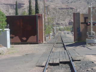 At Milepost 1215.7 are flood gates since it has been flooded a number of times since its founding. In 1983, it was decided to protect the community with a series of flood walls and a flood warning system was finished in 1993, a levee and flood gate designed to protect the town was finished in 1996, and families living in the flood zone were relocated in 1999.