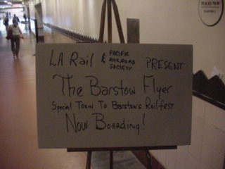 Pacific Railroad Society and LA Rail are proud to announce a special train from Los Angeles over Cajon Pass to Barstow in connection with Railfest 2009 at the Harvey House at Barstow. This train will leave Los Angeles Union Station at 8:00 am Saturday, October 17th. Passengers may also board the train at Fullerton at 8:40 am. This special train will consist of Amtrak coaches, and four private railroad cars including: open platform business car "Tioga Pass", lounge car "Overland Trail", sleeper "Salisbury Beach" and dome-diner "Silver Splendor". Western America Railroad Museum at Barstow sponsors Railfest each fall which includes modular train layouts courtesy of Pacific Coast Region of NMRA, craft and hobby vendors and tours of the restored Harvey House at Barstow. Admission to the rail museum and the Route 66 Museum will be included in the train passengers' fare. The volunteer staff of the railroad museum will prepare and serve a luncheon (included in your train fare) to all train passengers on the park area in front of the Harvey House. Make your reservations early. Only 6 coaches will be available. First class space on the private cars will sell out quickly.