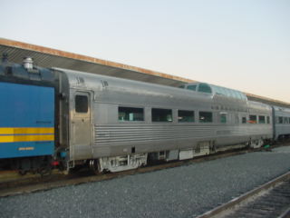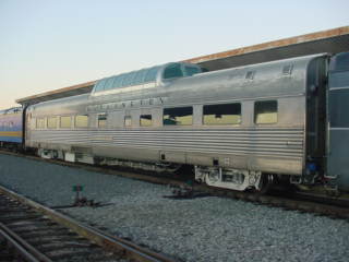 LA Rail Vista-Dome lounge-dining car "Silver Splendor", nee Chicago, Burlington and Quinicy 4735 "Silver Buckle" built by Budd Company in 1956. It was part of the last two complete conventional train sets to be ordered new in the pre-Amtrak era and traveled over 4.5 million miles on a daily basis between Chicago and Denver until 1980. With standard coach seating for 50 and 24 seats up in the dome, "Silver Buckle" provided fast and comfortable service for budget- minded patrons until Amtrak's bi-level Superliners arrived. Officially retired in 1981, the car spent time in storage at Oakland, California and Beech Grove, Indiana before being auctioned off by Amtrak to a railcar shop owner in 1993. In 1997, the current owners, Heidi and John Caestecker, purchased the car in the Midwest and moved it to Fullerton with the intent of restoring it to operating condition as a luxurious dome-diner-lounge. Dining capacity will be 24 at tables upstairs and another 24 in the long end of the lower level. A cocktail lounge seating 10-12 will be featured in the short end, with kitchen and restrooms under the dome.