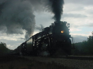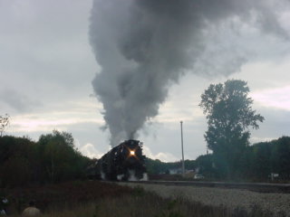 Photo runby two. We all reboarded and the train continued on its way back to Alma, passing through several rain showers. We became a night train and I rode the vestibule for part of the trip and enjoyed my open window when it was not raining. Our return to Alma was about two hours late but all passengers were happy after an excellent double-headed steam excursion behind Nickel Plate 765 and Pere Marquette 1225.