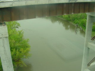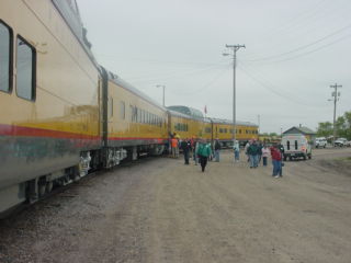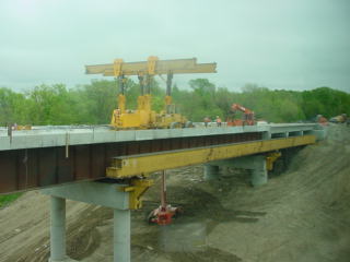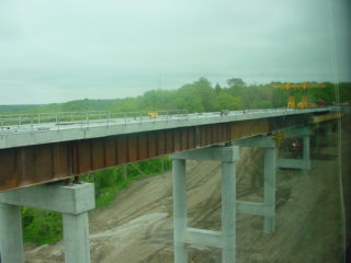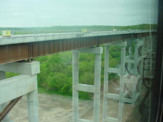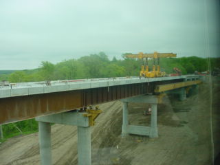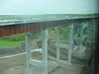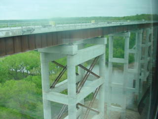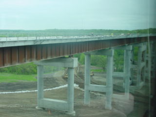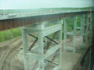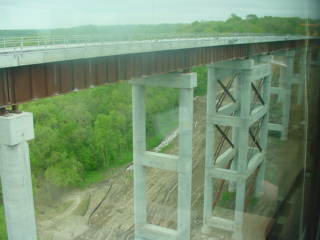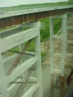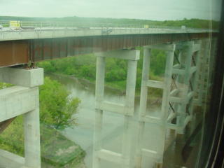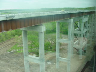 The rear of our train. We reboarded and now from my seat in the "Missouri River Eagle", we would look at the new bridge under construction which started in 2007 and is 90 feet north of the old one. It will be a double track bridge ballast deck on a reinforced concrete tower. It is designed for 70 MPH operations and two trains can be operated at that speed across the bridge at the same time. Its length is 2,813 feet with a height of 190 feet and the cost is estimated at $42 million.