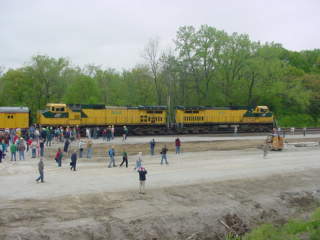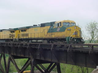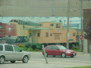 In downtown Boone is Rock Island caboose 17022, built by International Car in 1958 and painted as Chicago and North Western 12566 is in front of this mural painted by Boone High School students in 1984. The train reversed into the Fair Ground spur, where this wonderful train trip ended. Special thanks to the Chicago and North Western convention staff for making this possible, as well as the Union Pacific Railroad for running this trip for us to enjoy. I had the opportunity to ride across the Kate Shelley High Bridge twice in one day and detrained a happy train rider.