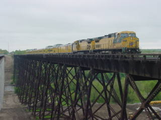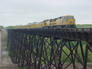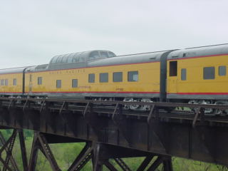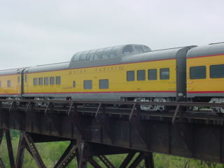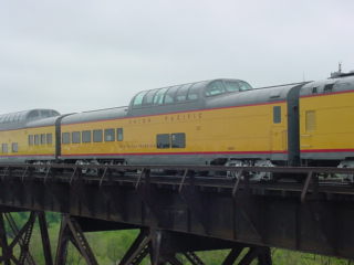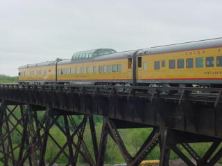 Passenger cars of the magnificent Union Pacific Passenger Fleet reversed onto the Kate Shelley High Bridge.