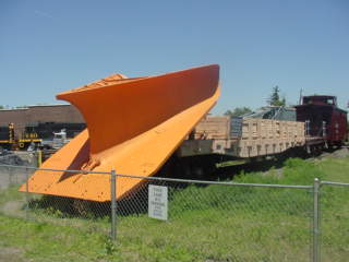 Chicago, Burlington and Quincy wedge snow plough 205065, nee Chicago, Burlington and Quincy 50 foot flat car 91143 built by the railroad in 1929. It was loaded with broken stone to give extra weight and stability and coupled to the front of a locomotive, it would then be given a running start to ram into a snowdrift as far as it could go. This particular piece of machinery was used for many years between Sterling, Colorado and Cheyenne, Wyoming.