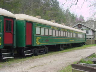 Passengers board at the depot of the Eureka Springs & North Arkansas Railway, originally built in 1912-13 to replace a wooden depot built in the 1880s. The passenger train uses several former Rock Island P-70 coaches. There have actually been as many as seven of these cars on the property at any one time. Two cars were used for the regular passenger service - maroon 2560 and green 2585. Two more are used for the dinner train, currently numbered 1 and 2. Two more are used as buildings - 2515 is used as a snack bar while 2523 has been used as an office. Another coach, 2593, was also once here.