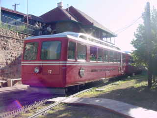 The first units to arrive from Switzerland were Nos. 14 and 15, which were put into service in 1964. They proved so successful that soon after, the Railway ordered two more nearly identical units, Nos. 16 and 17. These Swiss railcars are self-contained units, powered by two Cummins diesel engines mounted underneath the seating area. As with the GE locomotives, they are diesel-electric trains. Generators driven by the diesel engines provide the power to traction motors for the ascent. For the descent, the diesel engines are shut down and the traction motors work as generators. Heat is disippated by resistor banks on the roof of the railcars.