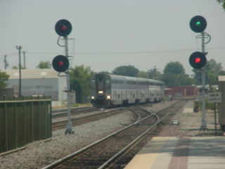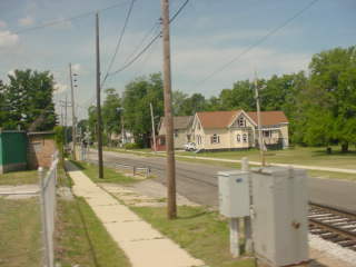 Chicago, South Shore and South Bend Railroad street-running in Michigan City. At Porter, there was no delay as the train reached the Norfolk Southern mainline for the rest of the trip into Chicago, passing the Indiana Dunes