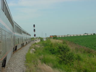 At Cameron Junction, where we left the former Chicago, Burlington and Quincy mainline for the former Santa Fe mainline, we passed this BNSF freight waiting for us to clear. Passengers were finally called into the dining car and I had the Braised Flat Iron Bordelaise for my dinner. As previously announced, dessert was not served as they wanted to clear out each seating as quick as possible, which was unacceptable and added to my grief with this trip. Back in my room, I watched "Hannah Montana in 3D" DVD then paused it at La Plata to call out "Hello" to Bob Cox when we stopped there. Tired, I made up my room and called it a night.