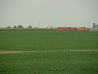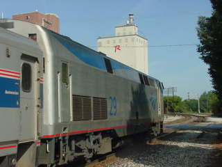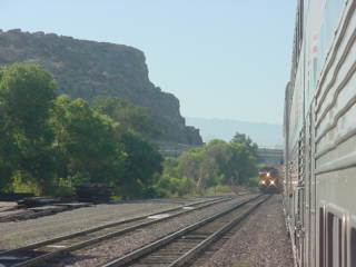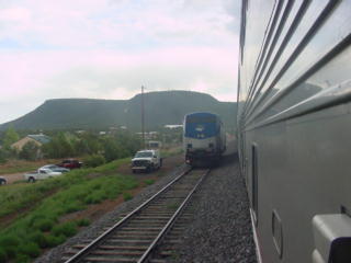 The view of the train while we were stopped, after which wed were told the lead engine had an air break problem that had locked its brakes. At 3:10 PM, while I was in the shower, we moved slowly, pushing P42DC 25 with the other two engines and train into the siding at Rowe. I watched Cheap Trick's "Live" DVD then the eastbound Southwest Chief finally passed us at 4:09 PM on its way to Chicago arriving, there 1 hour and 35 minutes late at 4:55 PM. Our conductor told me that this was a first and the Amtrak motive power desk had no idea what to do. A call to General Electric gave them the solution of how to get the brakes unlocked the engine but it would have to be chained down to keep from rolling away.