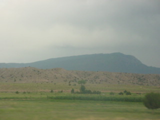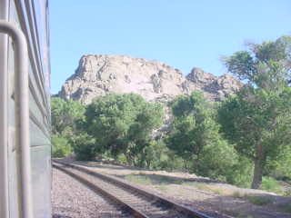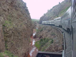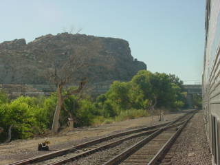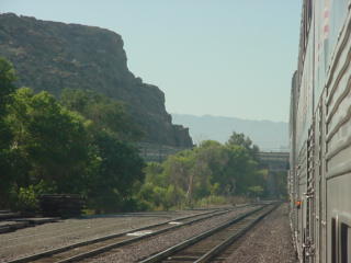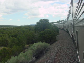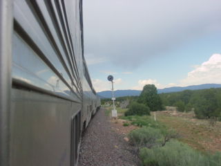 I awoke early short of Garden City, Kansas and enjoyed French Toast and sausage patties for breakfast then napped in bed until Lamar and at La Junta, accessed the Internet and saw that my Trainorders.com posts had again been consolidated. This morning, the coffee maker in the dining car was not working so no hot beverages were available. I worked on my Orange County Railway Historical Society program for September before taking fresh air at Raton. At 12:00 PM, I had the Angus beef burger with the peanut caramel et cetera dessert. I listened to the Gandy Dancers CD and after that, Jethro Tull's "This Was". At 1:55 PM, we stopped just passed Signal 813.1 before the siding at Rowe, New Mexico.