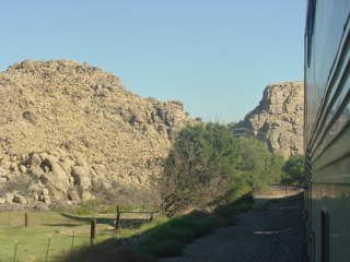 7/29/2009 I awoke at the US Highway 95 Crossing west of Needles, California and went to the lounge car to wait for breakfast that was supposed to be at 6:30 AM. At 6:35 AM, I was berated by a member of the crew while waiting for the dining car to open in the sleeping car hallway. "Either go back to your room or lounge car to wait but not here!" When I asked when the dining car might be open, she said to wait for an announcement. I went and visited with the excellent conductor Dave Arthur when it was announced "The dining car ventilation system is out and thus we can not serve any breakfast." Dave told me that food would be brought on at some point and I replied that it would most likely have cheese on it and I cannot eat it." The train made its way to Barstow where we had a fresh air break then departed at 7:51 AM {3:39 AM}.