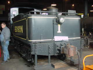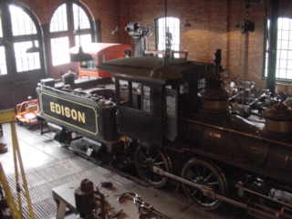 Greenfield Village 4-4-0 1 "Edison", based on an 0-4-0 switcher locomotive built about 1870 by Manchester Locomotive Company. Henry Ford purchased the switcher from Edison Portland Cement Company in 1932 and had it rebuilt into a 4-4-0 wheel arrangement by staff at Ford Motor Company's Rouge locomotive shop.