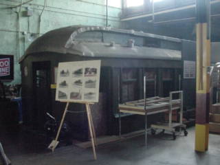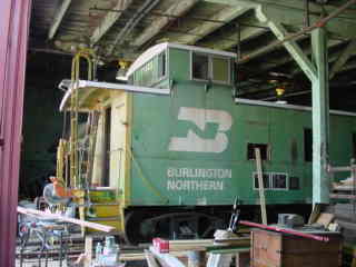 In 2003, after the completion of the turntable connected its track, 13500 was moved into roundhouse stall 14, part of a wood-shop area being developed. During its short time parked outside at Jackson Street, its roof had rapidly deteriorated and needed replacement to avoid further damage. Because it is well-suited for the Jackson Street caboose rides (lots of windows and seats) it became the first wood-shop restoration project. Restoration started with replacement of rotten roof boards and canvas. The restoration leader determined that 13500 was most likely the CB&Q's first steel caboose. It is the lowest numbered NE-10, which is the first series of CB&Q steel cabooses.