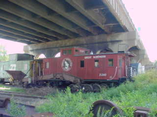 Burlington Northern caboose 11445, nee Chicago, Burlington and Quincy 13500 built by the railroad in 1930. In 2000, Bandana Square in St. Paul, (formerly the Northern Pacific's Como Shops,) donated it to the Minnesota Transportation Museum. It had been on display there for close to 20 years and the roof was starting to leak, but it was still in decent shape. MTM trucked it to Jackson Street and parked it on old, nearly-buried trackage that was not yet connected.